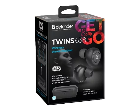 Bluetooth стереогарнитура Defender Twins 638 черный, 63638