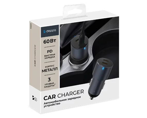АЗУ-2USB-C Deppa PD, 60W, металл, серый, 11223